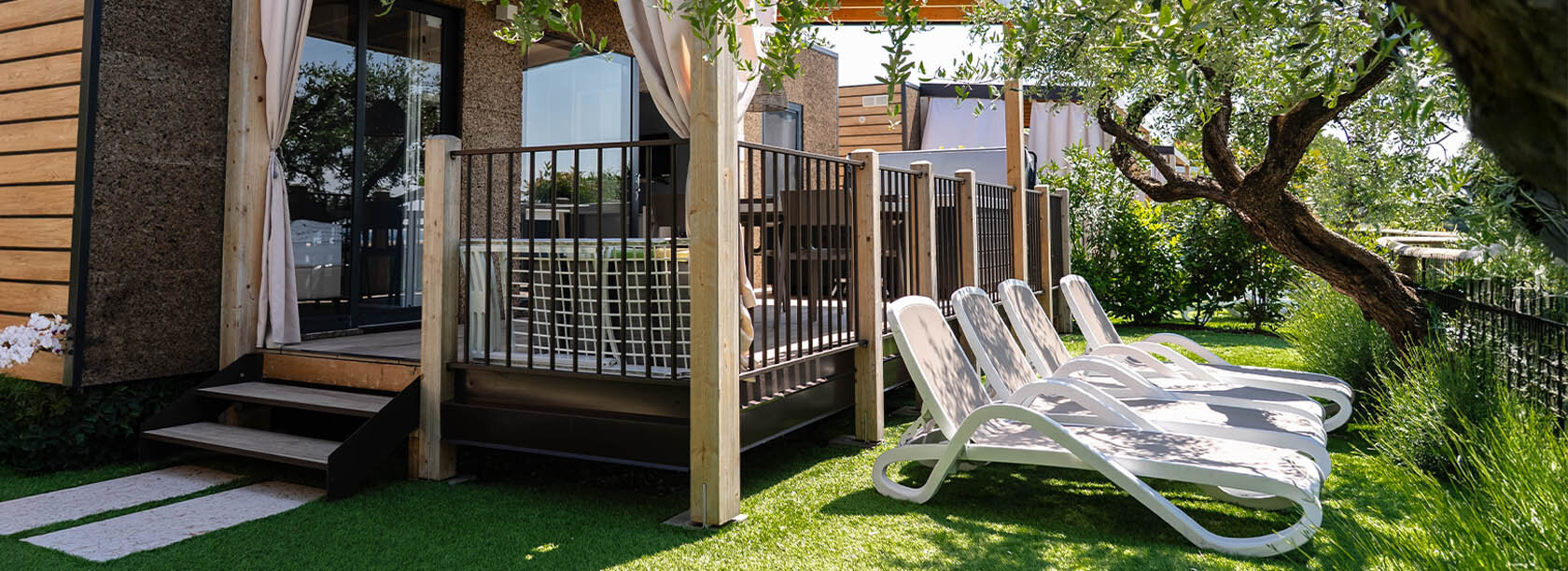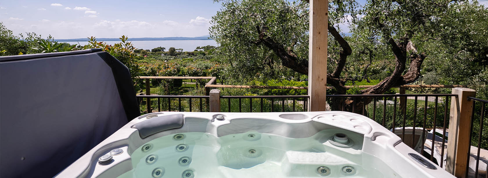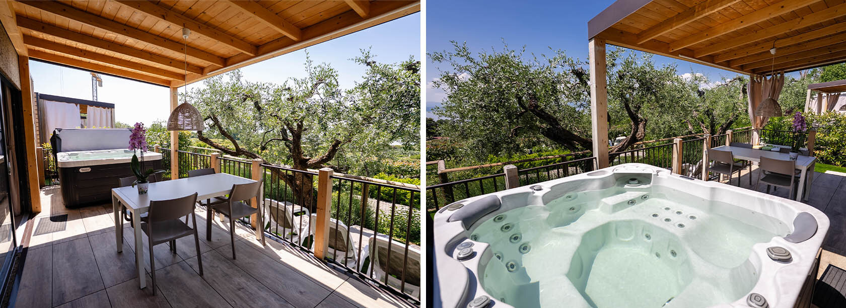 The ideal mobile home for lovers of relaxation. A solution that allows you to experience all the spaces available with comfort. The external area, immersed in the olive groves of Borgo Olivi, has a personal hydromassage tub in which to relax and enjoy the view of Lake Garda.