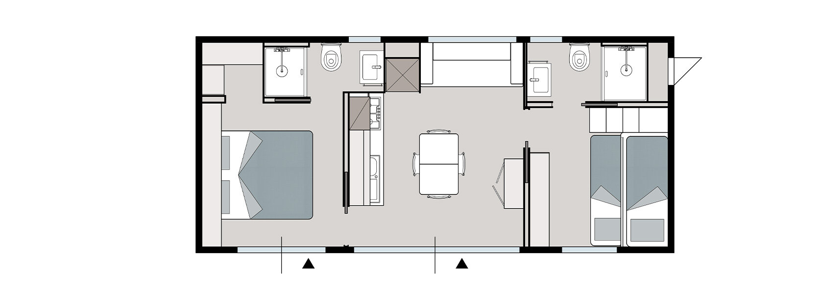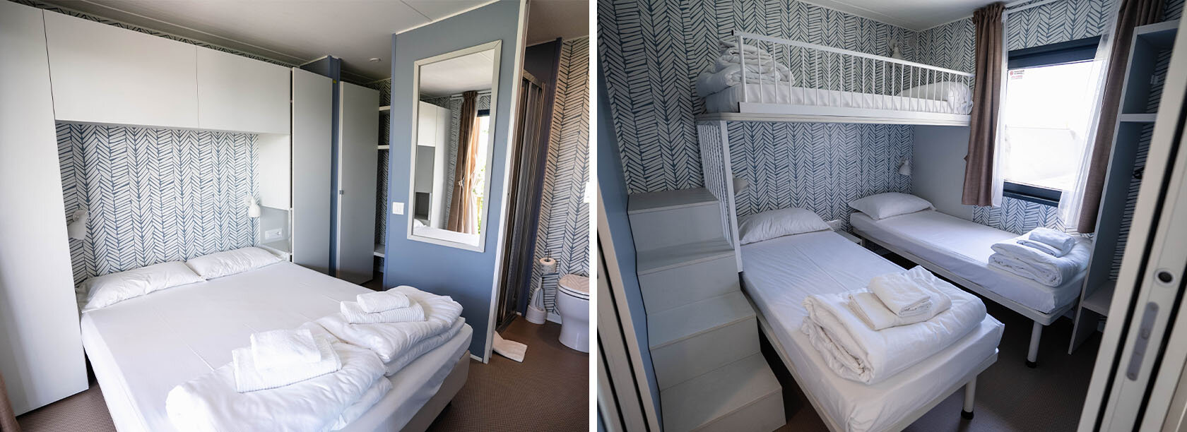 The Olivi Hydro Extra mobile home has an area in which you can find: bedroom with double bed, children's bedroom, equipped with 3 single beds, 2 bathrooms with shower and living area.