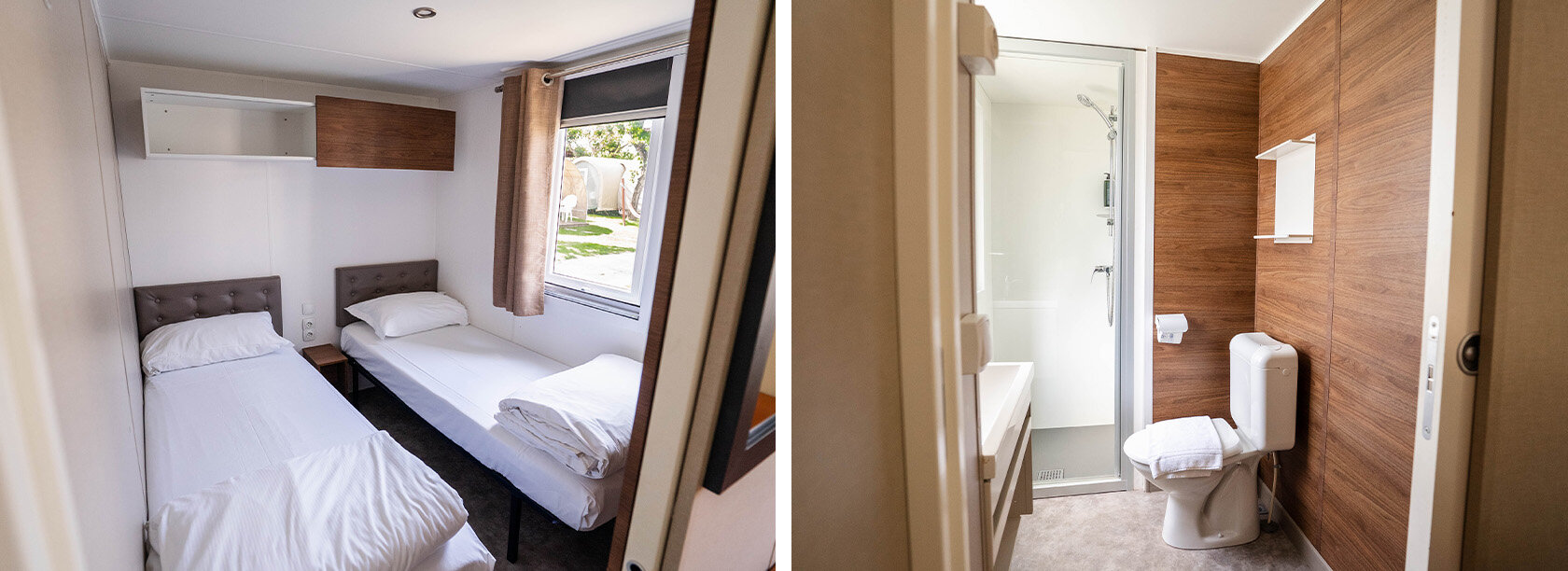 The houses consist of a sleeping area with a large bedroom and a bedroom with 2 single beds. The bathroom has a window and has a shower, sink and toilet.