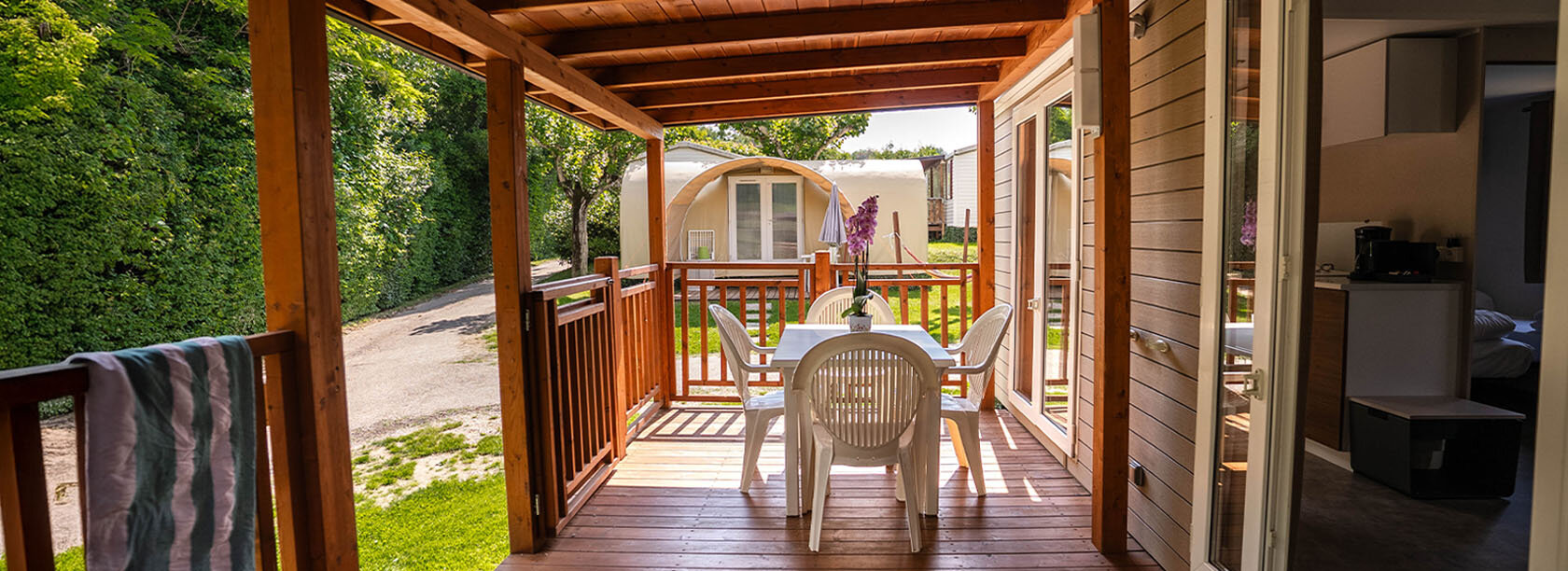 Surrounded by vegetation and in the shade of tall trees, Fossalta mobile homes can comfortably accommodate up to 5 people. These are the housing units chosen by numerous families because they are convenient to the camping services and are mostly shaded.