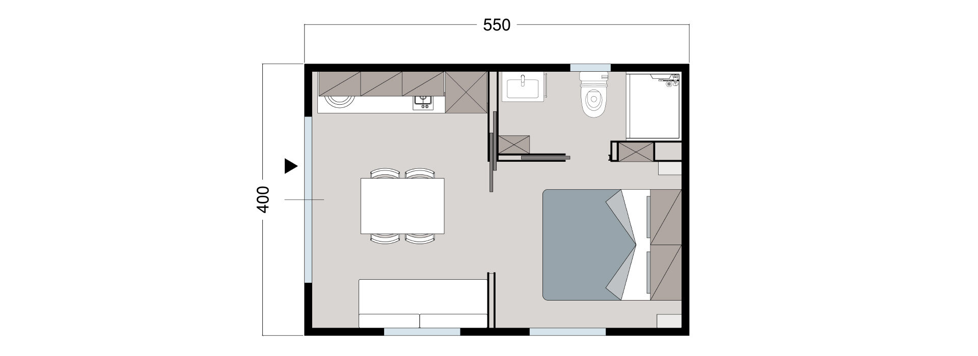 The Olivi suite has an area of 22 m2 in which you can find: bedroom with double bed, living area with sofa bed and kitchen in a single open space.